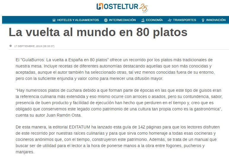 El portal online Hosteltur, experto en noticias de turismo para profesionales y empresas turísticas, ha hecho una reseña del «GuíaBurros: La vuelta al mundo en 80 platos», de Juan Ramón Osta, un libro que explica cómo elaborar las mejores recetas de la comida española. Desde la fabada asturiana, pasando por el pisto manchego, hasta 80 recetas de nuestra rica gastronomía.